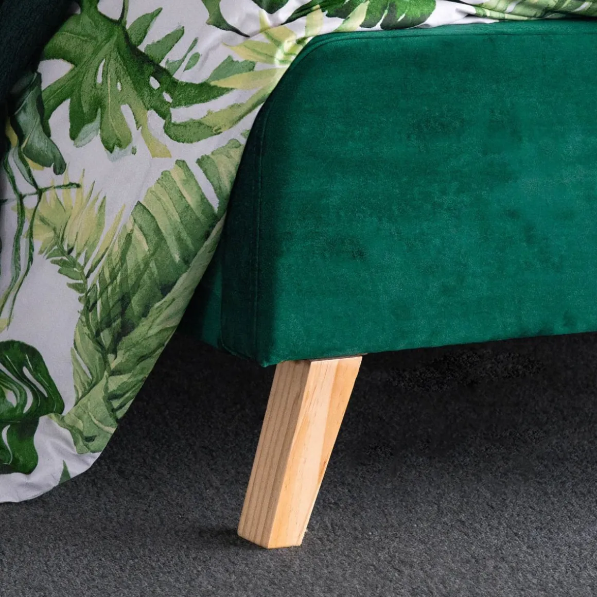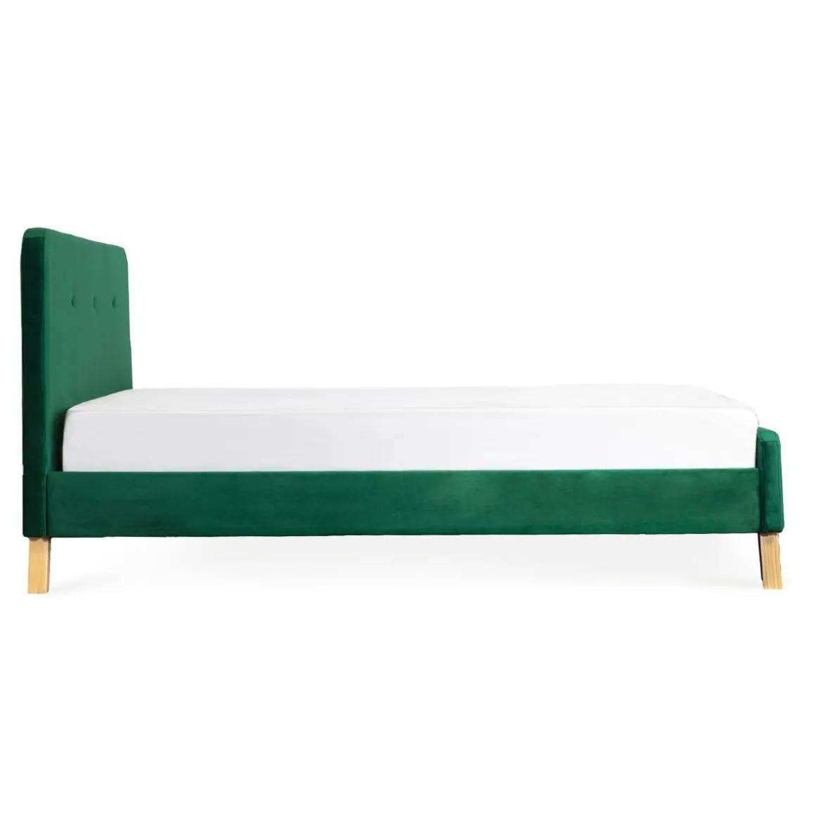 Łóżko Mikkel Obite Zostało Poliestrowym Welurem W Kolorze Butelkowej Zieleni. Jego Dno Wykonane Zostało Z Drewnianych Listewek, Co Umożliwia Swobodny Przepływ Powietrza I Wentylację Dla Materaca. Pasować Będzie Do Niego Każdy Materac O Wymiarach 160X200Cm.Produkt Do Samodzielnego MontażuW Zestawie Stelaż