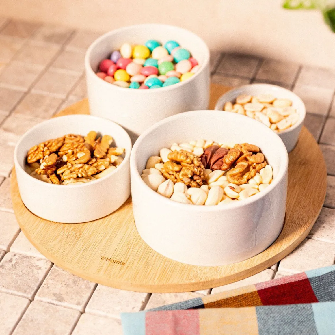 Zestaw Do Serwowania Homla Yifan Sprawi, Że Nawet Najprostsze Przekąski Oczarują Twoich Gości. Doskonale Sprawdzi Się Podczas Niezapowiedzianej Wizyty Przyjaciół, Gdy W Szafkach Masz Tylko Oliwki, Orzeszki I Krakersy, A Także Podczas Eleganckich Przyjęć I Rodzinnych Spotkań. Zestaw Składa Się Z 4 Różnej Wielkości Miseczek Oraz Bambusowej Podstawki Z Wgłębieniami, Które Zapewniają Miskom Stabilność. Połączenie Bieli I Koloru Naturalnego Drewna Sprawia, Że Komplet Wspaniale Się Prezentuje Na Stole, Kuchennej Wyspie Czy Stoliku Kawowym.Przeznaczenie